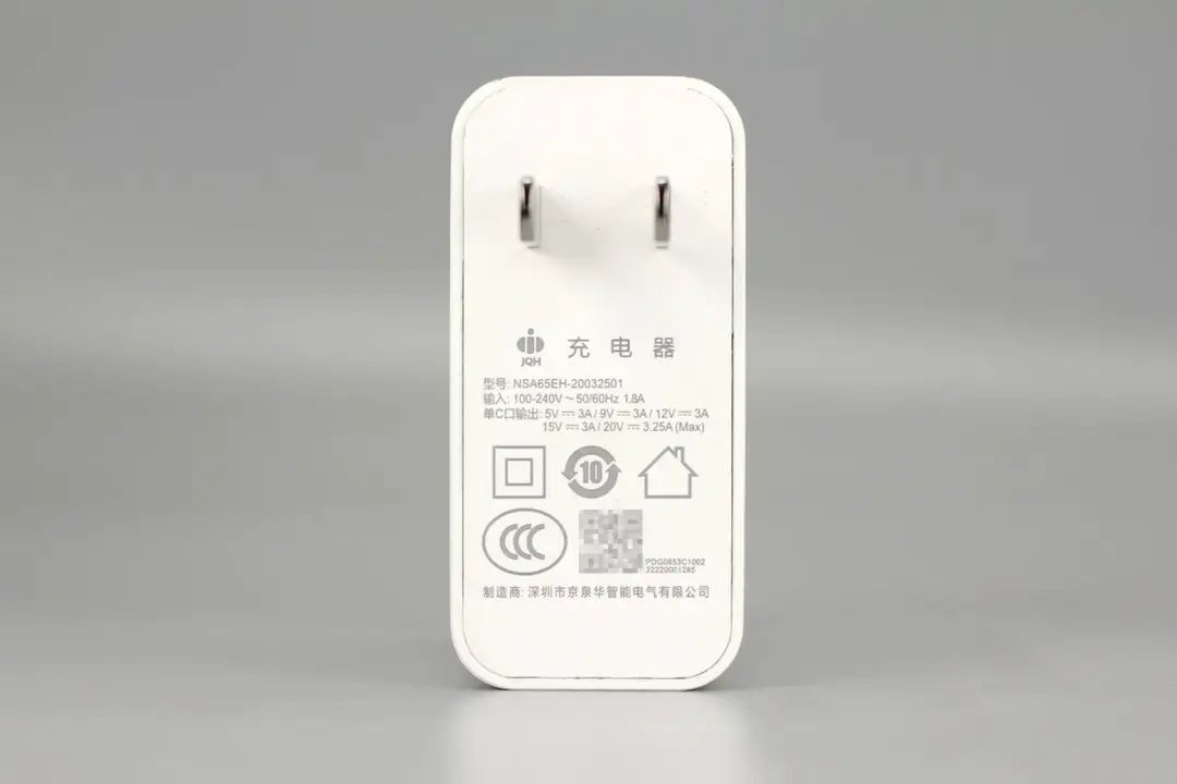 聯(lián)想這款充電器采用白色機身,固定插腳,標(biāo)準(zhǔn)的配機充電器設(shè)計。充電器支持65W PD快充,得益于通用的USB PD接口,這款充電器除了為配套的投影儀供電外,還能為筆記本供電,十分方便。