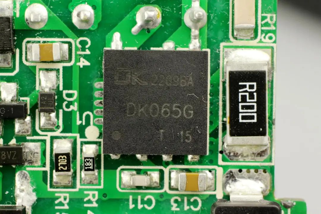 充電器初級主控芯片采用了一顆來自東科的合封氮化鎵芯片DK065G,是一顆內(nèi)部集成了650V氮化鎵開關(guān)管的準(zhǔn)諧振反激開關(guān)電源功率芯片。DK065G采用谷底開通以降低開關(guān)損耗,最高支持250kHz開關(guān)頻率,待機功耗低于50mW,采用DFN8*8封裝,適用于PD快充,電源適配器等應(yīng)用。