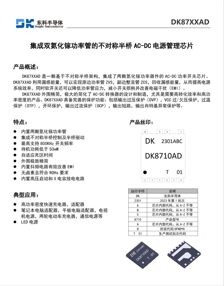 東科半導(dǎo)體推出基于不對稱半橋架構(gòu)的全合封氮化鎵AC-DC電源管理芯片DK8715AD系列